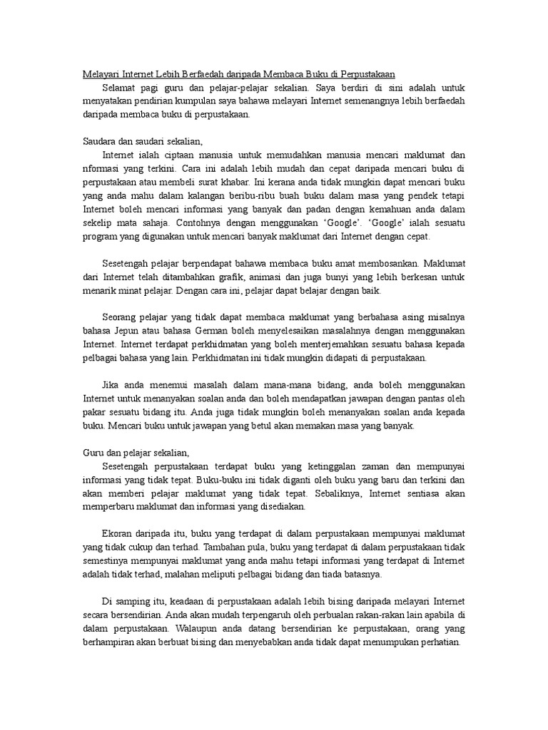 Walau bagaimanapun teknologi internet ini kerap. Karangan Perbahasan- Terdapat Lebih Banyak Kebaikan Melayari Internet Berbanding Keburukan. Hari ini saya akan membuat satu contoh karangan perbahasan yang jarang digunakan di sekolahSaya akan menunjukkan satu persatu langkah untuk membuat karangan perbahasan.
