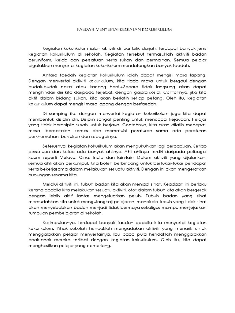 Pelajar yang aktif dalam kegiatan ini akan terhindar daripada terlibat dengan gejala sosial kerana banyak masa mereka digunakan untuk aktiviti kokulrikulum di sekolah seperti sukan dan sebagainya. Contoh karangan pt3 kebaikan menyertai aktiviti kokurikulum aktiviti kokurikulum merupakan satu daripada elemen yang terdapat dalam pendidikan di sekolah. Pelbagai aktiviti kokurikulum yang dijalankan di sekolah misalnya aktiviti kelab dan persatuan sukan dan permainan serta pasukan beruniform.