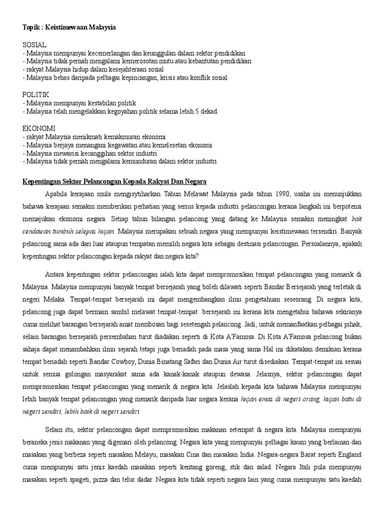 Kerajaan Persekutuan telah melakukan pelbagai pelaburan dengan jumlah peruntukan dana yang tinggi bagi membangunkan sektor pelancongan negara. Antara kepentingan sektor pelancongan ialah kita dapat mempromosikan tempat pelancongan yang menarik di Malaysia. Setiap tahun pastinya terdapat soalan yang menjadi pilihan untuk keluar ketika peperiksaan awam seperti SPM dijalankan.