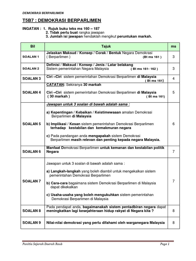 B Latar belakang sistem demokrasi berparlimen di Malaysia ialah sistem demokrasi berparlimen mula diamalkan sejak negara mencapai kemerdekaan pada tahun 1957. Malaysia pula mengamalkan sistem pemerintahan Demokrasi Berparlimen dan Raja Berperlembagaan sejak mencapai kemerdekaan tahun 1957. Kesemua ciri ini ada dibincangkan dalam Bab Tujuh halaman 170-193 Buku Teks Sejarah Tingkatan Lima.