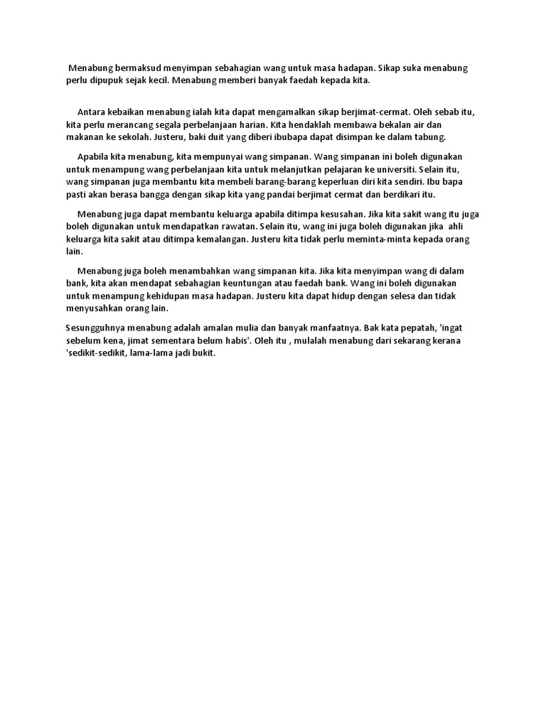 Penutup Karangan Amalan Menabung. Karangan UPSR - Faedah Menabung. Wang atau duit digunakan untuk membeli serta mendapatkan barang- barang keperluan harian makanan minuman dan lain-lain.