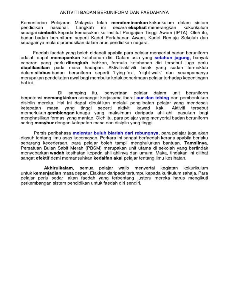 Kepentingan Menyertai Pasukan Unit Beruniform. Sesungguhnya ibu bapa dan para pelajar perlu dicelikkan supaya menyedari kepentingan menyertai badan beruniform. Aktiviti kokurikulum merupakan satu aktiviti wajib di setiap sekolah.