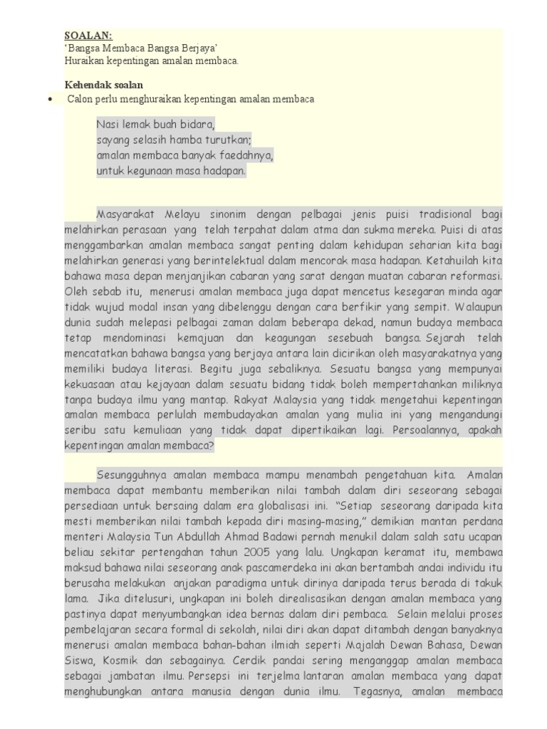 Feb 02 2021 contoh karangan spm kepentingan amalan membaca soalan. Bincangkan kebaikan membaca kepada semua lapisan masyarakat terutamanya golongan remaja. Ringkasnya jelaslah bahawa amalan membaca dapat memberikan pelbagai kemaslahatan kepada para pelajar untuk berjaya.