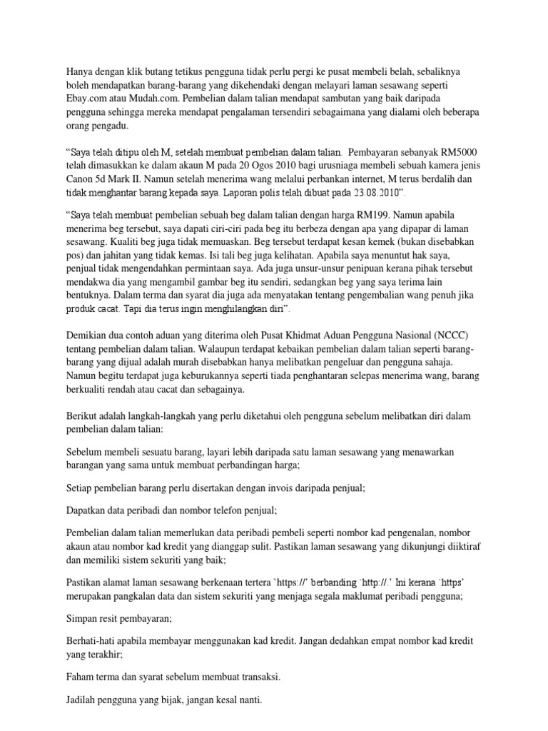 Pada zaman revolusi teknologi telekomunikasi dan multimedia tanpa had ini internet menjadi perkara penting dalam kehidupan kita. Belian rahsia Sesetengah barang agak memalukan untuk dibeli secara terbuka. You have just read the article entitled karangan kepentingan membeli belah.