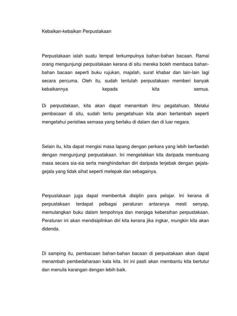 Peraturan ini akan mendisiplinkan diri kita kerana jika ingkar mungkin kita akan didenda. Tempat letak perpustakaan Jenis perpustakaan Huraian perpustakaan Perpustakaan adalah gedung ilmu. Banyak bahan bacaan yang dikumpulkan dan disimpan.
