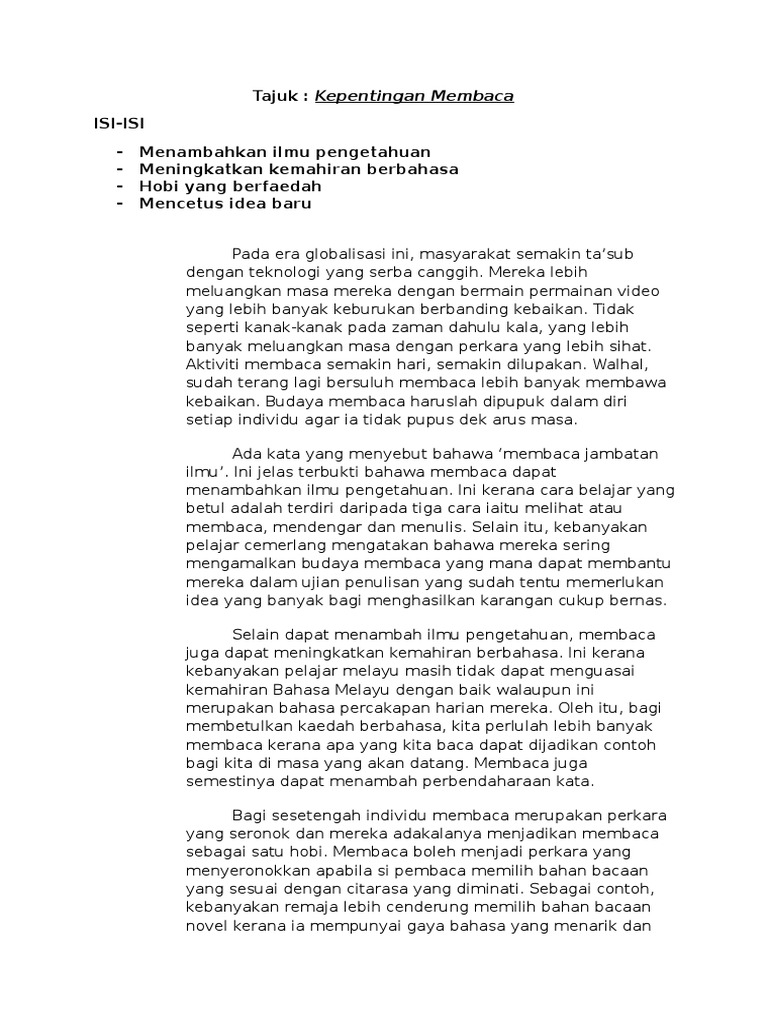 Kempen-kempen untuk memberikan kesedaran kepada rakyat tentang kebaikan membaca perlu diteruskan dan dipelbagaikan kerana banyak kebaikannya. Koleksi Contoh Karangan SPM Bahasa Melayu Sijil Pelajaran Malaysia Berikut adalah contoh-contoh karangan mengikut tema yang selalu digunakan sebagai tajuk soalan karangan Bahasa Melayu. Mengurangkan tekanan yang dihadapi.