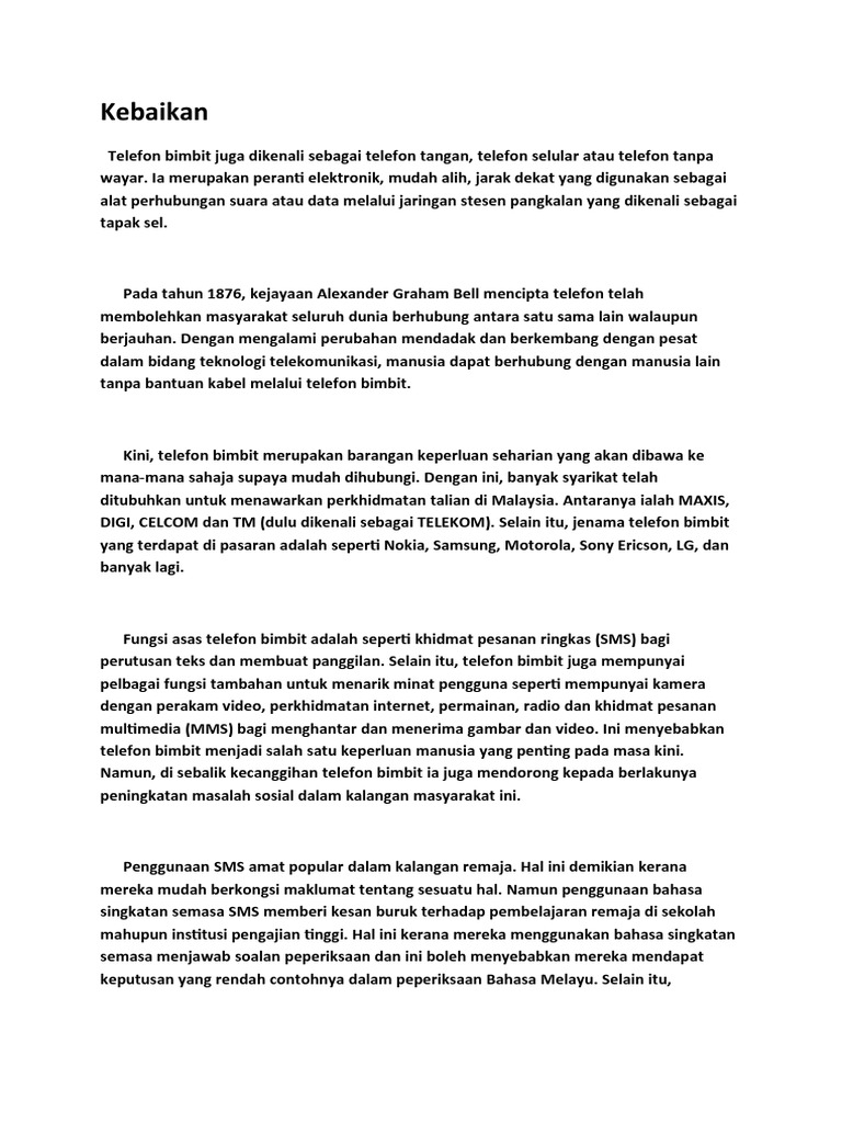Kebejatan suasana penggunaan telefon bimbit dalam ruang lingkup golongan yang berstatus pelajar di sekolah hari ini pada tahap yang membimbangkan. Kebaikan telefon pintar yang pertama ialah sebagai alat perhubungan atau komunikasi jarak jauh. Semoga perkongsian bahan-bahan rujukan panduan bahan pembelajaran dan pengajaran contoh-contoh karangan sumber rujukan SPM Sijil Pelajaran Malaysia tingkatan.