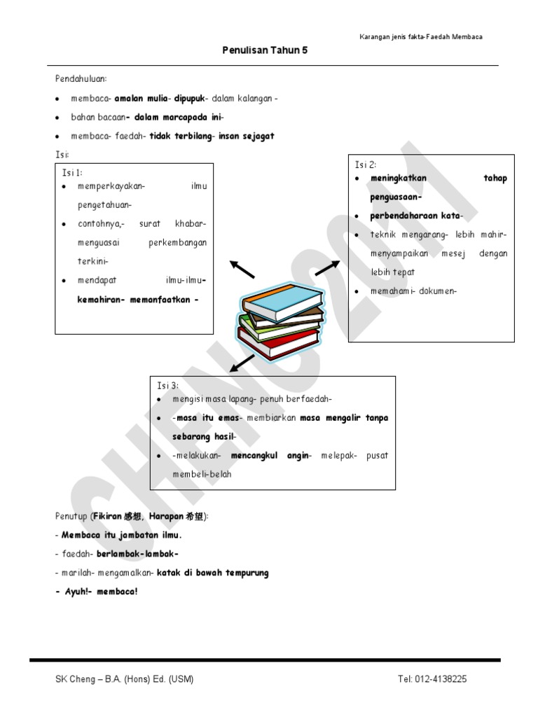 Tulis sebuah karangan yang bertajuk Faedah Membaca. - menggunakan masa berfaedah hobi - aktiviti Isi 3. By the way this essay is from my trial last year.
