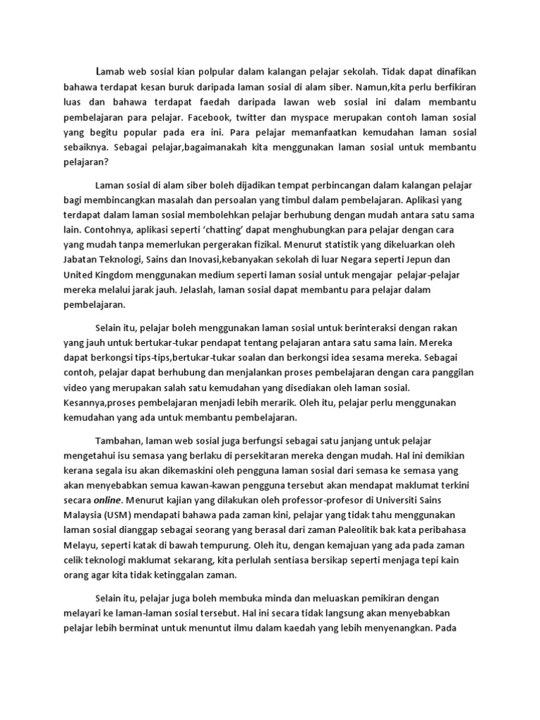 Karangan Kebaikan Media Sosial - Contoh Karangan Peranan Ibu Bapa. Sebagai contoh di waktu dulu ketika ingin melakukan majlis jemputan kahwin perlu mencari alamat rakan-rakan masing-masing. Karangan STPM Isu Laman Sosial Pada masa ini penggunaan laman sosial melalui internet amat popular di Malaysia.