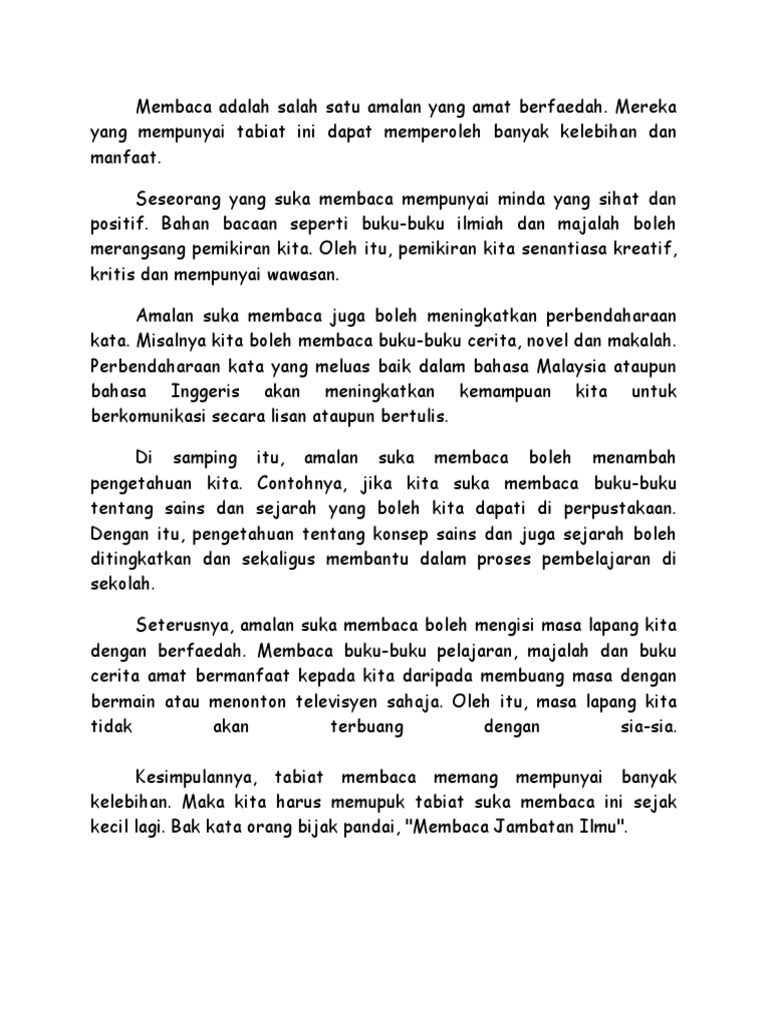 Antaranya novel buku cerita majalah dan ensiklopedia. Kamu perlu menulis sekurang-kurangnya 2 atau 3 ayat dalam satu perenggan. Budaya membaca ini masih dianggap remeh oleh sebahagian masyarakat walaupun isu ini kerap dibincangkan.