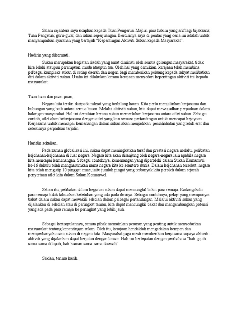Kepentingan Menyertai Aktiviti Kokurikulum Yang dihormati Tuan Pengerusi Majlis Yang Berusaha Tuan Pengetua Sekolah Sekolah Menengah Kebangsaan Permai Yang Mulia para guru ibu bapa dan murid yang dikasihi sekalian. Terdapat banyak jenis kegiatan kokurikulum di sekolah. Dalam meniti era tanpa sempadan pihak sekolah semakin giat menjalankan aktiviti demi memperoleh kejayaan yang memberi manfaat kepada murid.